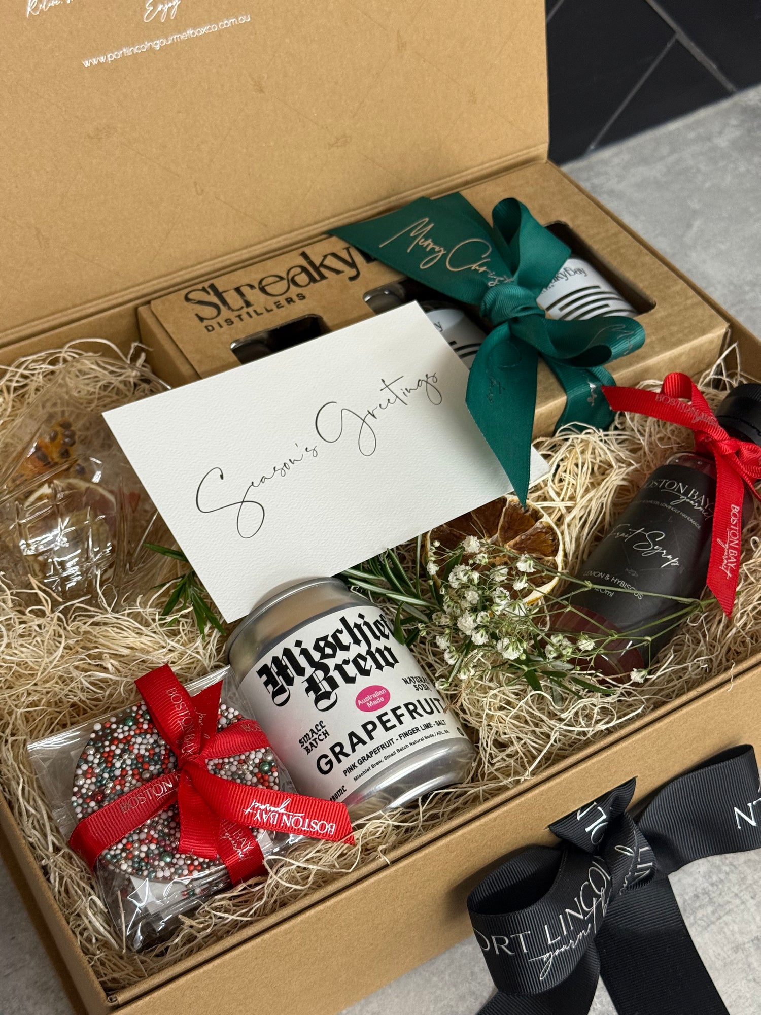 Indulge your gin loving mates with the ultimate gift for gin lovers. Our "Gin-gle Bells Gift Box" is thoughtfully curated and elegantly packaged, offering a selection of exquisite items that promise to delight and impress. Perfect for any occasion, this ready-to-gift box combines premium locally made gin with gourmet accessories, creating a memorable experience for the recipient.