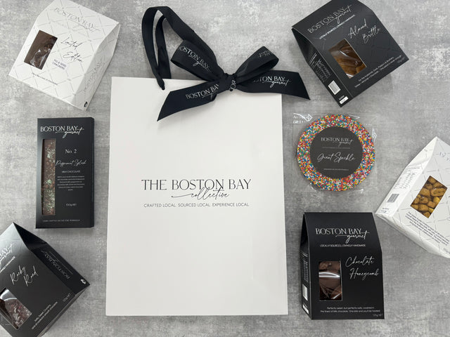Our goodie bag features an array of premium couverture chocolate confections and snacks from Boston Bay Gourmet, our favourite hand made and gourmet food curators right here on the Eyre Peninsula in beautiful, Port Lincoln, SA. Perfect for any occasion, snacks for yourself, your work friends or ready-to-gift to your nearest and dearest - our Sample Bag promises to impress and satisfy with its exquisite flavours and high-quality ingredients.