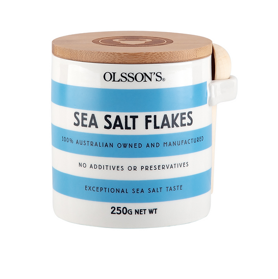 Our award-winning Olsson's Sea Salt Flakes are now available in this beautiful 250gm stoneware jar. This will make an excellent addition to any kitchen bench, family table or as a salt cellar in cafes, restaurants and the home. This will represent a significant value proposition (as well as being environmentally friendly) to customers as once they have the stoneware jar they can refill this container with Olsson's Sea Salt Flakes 250gm carton or larger foodservice sizes.